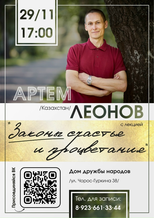 *ЗАКОНЫ СЧАСТЬЯ И ПРОЦВЕТАНИЯ | лекция* 29 ноября в 17.00 Горно-Алтайск | Дом дружбы народов *Ведущий: Артем Леонов* - специалист по личностному развитию, практикующий психолог, окончил Казахский национальный педагогический университет, факультет психологии и педагогики, более 25 лет изучает и практикует Ведическую философию и культуру под руководством Александра Хакимова. Проводит лекции, семинары и развивающие программы в России и в странах СНГ. Проводит индивидуальные консультации по вопросам духовного развития, личного роста и семейных отношений. Обладатель чёрного пояса по карате школы Годзю-рю. *ВЫ УЗНАЕТЕ:* • Что такое счастье и от чего оно зависит? • Почему одним в жизни везет, а другим нет? • Закон подлости или закон везения - это выбор • Цель - это непреходящее условие для достижения успеха • Что такое карма? • Процветание - это наше естественное состояние • Добродетель как источник счастья и процветания Стоимость участия: 500₽ *Так же, вы можете записаться к Артему Леонову на личную консультацию по следующим темам:* - семейные взаимоотношения - как раскрыть свой потенциал - как найти свое предназначение - отказ от вредных привычек - выход из стресса - преодоление депрессии - наставничество - духовная практика - и др *Запись по тел. 8 923 661 33 44* Канал встречи: https://vk.com/