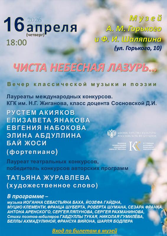 16 апреля (четверг) в Музее А.М. Горького и Ф.И. Шаляпина состоится программа-калейдоскоп музыкальных и поэтических произведений - "Чиста небесная лазурь...". Для Вас выступят студенты класса доцента Дарьи Игоревны Сосновской - лауреаты международных конкурсов Елизавета Янакова, Евгения Набокова, Элина Абдуллина, Рустем Ааияков, Бай Жоси (фортепиано). Будут исполнены произведения разных стилей и эпох.