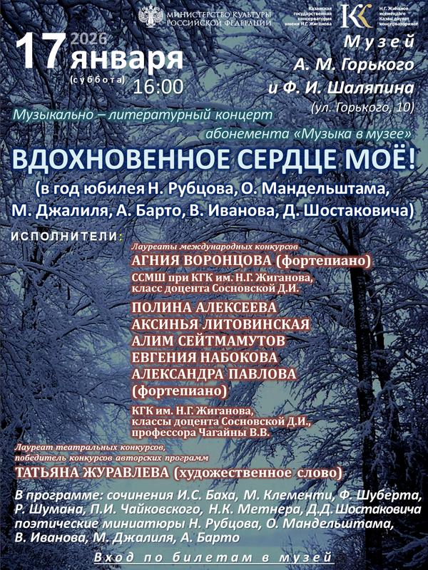 В субботу 17 января в Музее А.М. Горького и Ф.И. Шаляпина состоится первое в новом году концертное мероприятие "Музыки в музее" - музыкально-литературный вечер "Вдохновенное сердце моё!". В программе будет затронуто творчество юбиляров 2026 года - поэтов Н. Рубцова, А. Барто, О. Мандельштама, В. Иванова, М. Джалиля, композитора Д. Шостаковича, прозвучат и произведения для фортепиано И. С. Баха, М. Клементи, Ф. Шуберта, Р. Шумана, П. Чайковского, Н. Метнера.