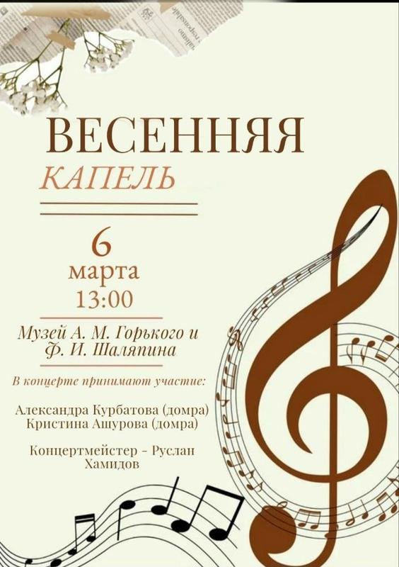 Мы приглашаем Вас посетить концерт "Весенняя капель", который состоится 6 марта в 13:00 в зале музея А. М. Горького и Ф. И. Шаляпина. Концерт приурочен к прекрасному празднику Международному женскому дню- 8 марта!