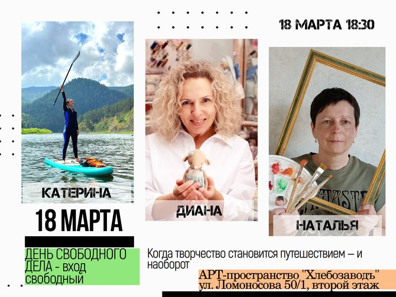 18:30 — слушаем истории от творческих путешественников — узнаем, как творчество ведёт в дорогу, а дорога — к творчеству.Место: АРТ‑Пространство «ХлебозаводЪ», 2‑й этаж - АРТ-коворкинг (ул. Ломоносова, 50/1)Условия участия: