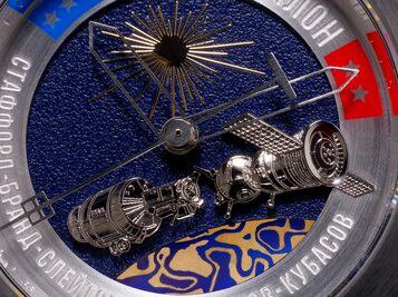 Сами же часы подтверждают свою уникальность не словами, а происхождением и составом материалов. В их основе лежит эксклюзивный сплав титана и золота, выполненный по древней технике «мокуме-гане» — японской кузнечной методике XVII века, созданной мастером Денбеем Шоами для художественного оформления клинков и ставшей эстетической основой коллекции. Дополняет этот уникальный образ декоративная вставка для модели «Союз — Аполлон» из метеорита МУОНИОНАЛУСТА: каждая единица обладает уникальным рисунком, возраст метеорита оценивается в 4,5653 ± 0,0001 млрд лет, а на Землю он упал примерно миллион лет назад.