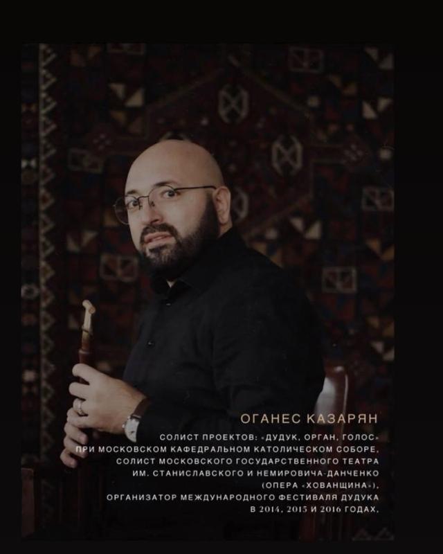 Сольный концерт Оганеса Казаряна в этом атмосферном месте -это концерт -размышление, разговор от души к душе, когда звуки мелодий проникают вглубь сердца и затрагивают самые тонкие струны нашего чувствования этого мира и взаимоотношений с ним. Концерт- размышление это 1 час незабываемых эмоций, которые вы сможете пережить наедине с собой под бархатное звучание неповторимого тембра дудука и, которые останутся с вами надолго.
