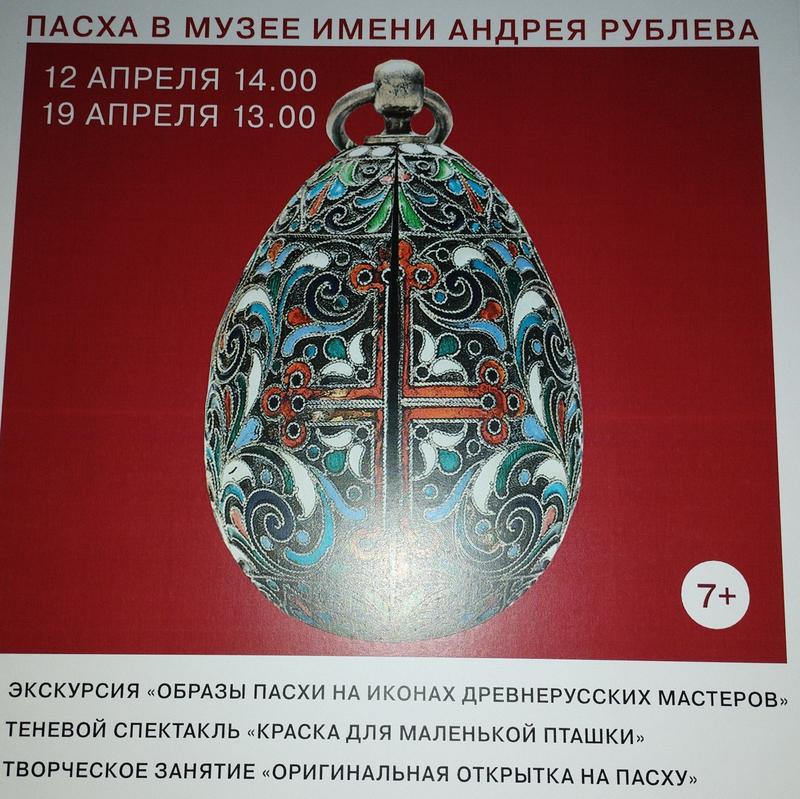 Во время экскурсии "Образы Пасхи на иконах древнерусских мастеров" участники познакомятся с сюжетами, посвящёнными событиям земной жизни Иисуса Христа, увидят подлинные шедевры русской иконописи. В музейном лектории актёры фолк-театра "Куролесье" представят теневой спектакль "Краска для маленькой пташки" по мотивам пасхального сказания знаменитой писательницы Сельмы Лагерлёф "Красношейка". На мастер-классе "Оригинальная открытка на Пасху" дети создадут поздравительную открытку, освоив искусство декорирования основы различными материалами. Программа завершится фольклорным действом, участниками которого смогут стать сами зрители.