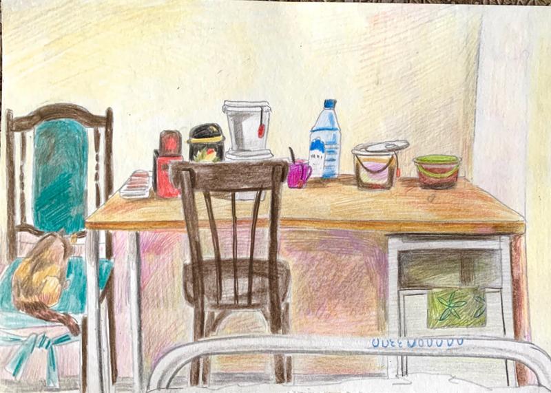 Серия графических работ, созданных в духе арт-брюта, отражает повседневность стационара — бытовые детали, кошек, отражение в телевизоре вместо зеркала. Это простые вещи, в которых художница находит красоту, тепло и надежду.
