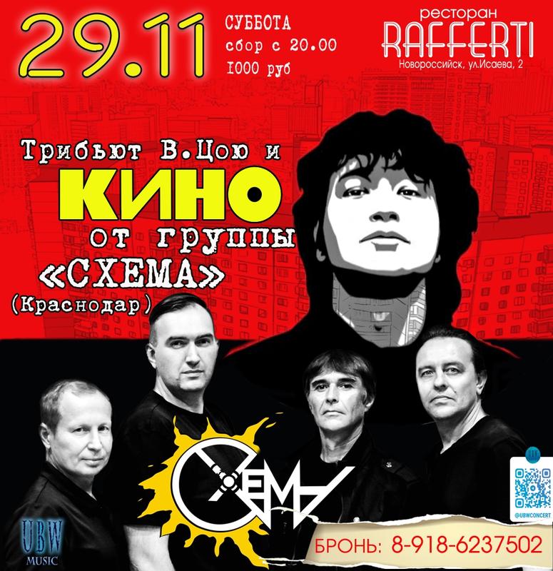 Группа Схема воссоздаст невероятное концертное звучание 'КИНО' 89-90-х годов благодаря максимально приближенному к оригиналу вокалу и отточенным аранжировкам. Вы услышите главные хиты, которые стали настоящей классикой: про кукушку, пачку сигарет, группу крови и все остальное, что вы любите и знаете!