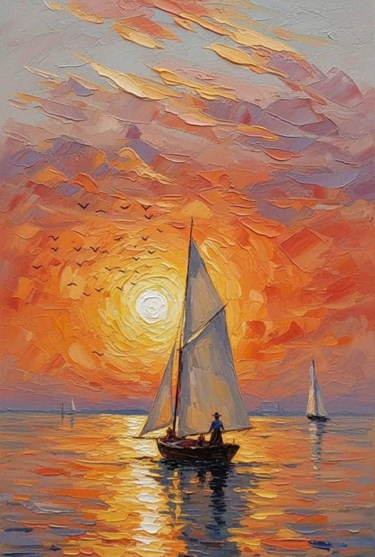 Морской закат: напишем с вами прекрасный закат с парусниками, акриловыми красками на холсте.