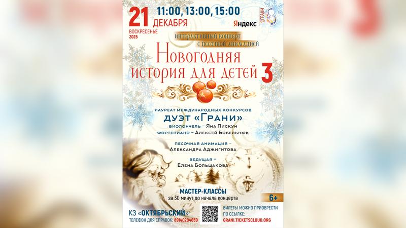 Представьте, как под прекрасную живую музыку в исполнении дуэта «Грани» (🎻🎹) рождается сказка. А художница Александра Аджигитова будет создавать иллюстрации из песка прямо на ваших глазах, превращая концерт в живое, дышащее чудо.