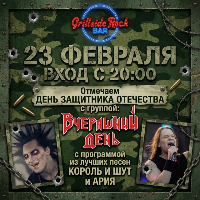 23 февраля / Вход с 20:00 / Grillside Rock Bar Отмечаем "День защитника Отечества" с группой ВЧЕРАШНИЙ ДЕНЬ с программой из лучших песен КОРОЛЬ и ШУТ и АРИЯ! Приходите, друзья! 500 руб. (предпродажа) 750 руб. (в день концерта) Входные билеты у промоутера (писать в личку)