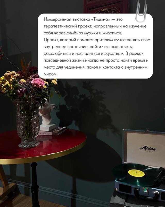 ТИШИНА - это иммерсивный арт-проект, в котором живопись и музыка соединяются, чтобы подарить зрителю опыт глубокой внутренней тишины, присутствия и эмоционального освобождения