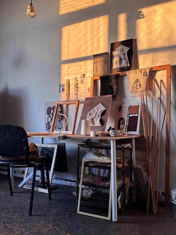 Сначала мы посетим мастерскую Таси Любимовой — междисциплинарная художница, фотограф, выпускница Школы Родченко. В проектах, часто это серии работ, она использует бэкграунд в сфере психологии, арт-терапии, основная тема ее творчества — трансформация в восприятии пространства и границ. Ранее художница пробовала себя в анимации, в своих последних работах она исследует феномен дома как переходного пространства через объемное ткачество, шитье по дереву. Текстильные произведения Таси Любимовой можно увидеть в ее мастерской, их создание занимает много времени, и на данный момент художница готовит крупную работу для open call. В качестве фотохудожника участвовала в таких ярмарках и фестивалях современного искусства, как Win-Win Market, Nizina Fest, |catalog|. Анимационный фильм художницы был представлен на зарубежных фестивалях: Dance Festival Pedra Dura (Португалия, 2023), The LIFT-OFF Global Network Festival (Англия, 2023).