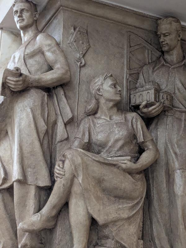 И завершится наша экскурсия у станции метро "Нарвская", в убранстве которой архитекторы поместили свои изображения.