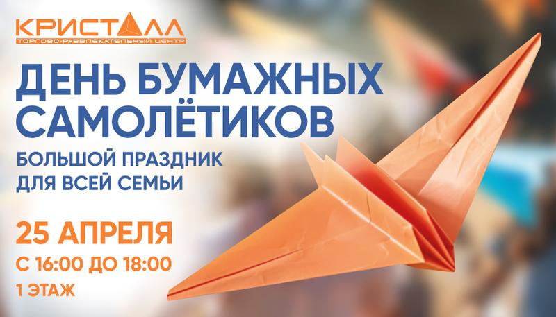 ТРЦ «Кристалл» приглашает вас и ваших детей 25 апреля 2026 года с 16:00 до 18:00 на большой праздник «День бумажных самолетиков», где каждый сможет вдохнуть жизнь в лист бумаги, почувствовать себя изобретателем и дизайнером и разделить радость творчества с близкими и друзьями.