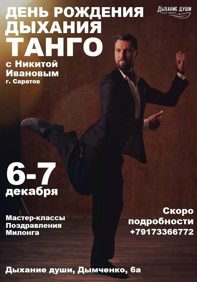 💜ДЕНЬ РОЖДЕНИЯ ДЫХАНИЯ ТАНГО с Никитой Ивановым 6-7 декабря💜 6-7 декабря мы будем отмечать 13й день рождения Дыхания танго. К нам в гости приедет замечательный преподаватель аргентинского танго из г. Саратов Никита Иванов 🤩. Прекрасный танцор, азартный диджей, а также превосходный музыкант, руководитель танго-оркестра и композитор! Никита танцует с 2012 года, преподаёт с 2015. За время своего пути в танго побывал на мастер-классах у Сильвио Гранда, Розалии Ванка, Станислава Фурсова, Андреса Сотеля, Селесты Медина, Карлоса и Бригиты Родригес, Вероники Паласиос, Омара Кирога, Хуана Альбы, Марианы Солер и многих других. Главный девиз: «В танго должно быть комфортно обоим». За годы изучения и преподавания танго Никита выработал свой стиль, основным постулатом которого является удобство танца вне зависимости от физических данных, а также уровня и стиля танцевания партнёров. Большое удовольствие наблюдать его танец со стороны, а ещё большее удовольствие - быть с ним в танце! Никита проведёт четыре МАСТЕР-КЛАССА, БЕСЕДУ о музыке и будет диджеить на МИЛОНГЕ😉. _______________________________ ПРОГРАММА И СТОИМОСТЬ 👇. 📆Суббота 6 декабря: 1️⃣️13:00-14:30 МК 1 "Мужские техники вращения и украшения для Хиро" (девушкам тоже можно) 2️⃣️14:50-16:20 МК 2 "Связки для танцпола с вращениями". 🎂20:00-02:00 Праздничная милонга. Выступления, поздравления, торт. 📆Воскресенье 7 декабря: 3️⃣12:00-13:30 МК 3 "Музыкальность шага на примере ритмичных и лиричных оркестров". 4️⃣13:50-15:20 МК 4 "Танго-вальс: ритмика вращений". 🎤15:30-17:00 Беседа о музыке аргентинского танго (от профессионального музыканта, организатора и участника танго-оркестра) _______________________________ Стоимость мастер-классов (длительность одного МК - 1,5 часа) до 30.11/с 01.12 1 мк - 1000/ 1300 2 мк - 1800/ 2100 3 мк - 2500/ 2800 3 мк+беседа - 3000/ 3300 4 мк - 3000/ 3300 4 мк+беседа - 3500/ 3800 4 мк+беседа при записи парой - 3200 /3500 Милонга - 600 руб. _______________________________ Обязательна предварительная запись у Олеси +79173366772 (vk, wa, tm). Подписывайтесь на встречу ВК и будьте в курсе новостей 👉 vk.com/